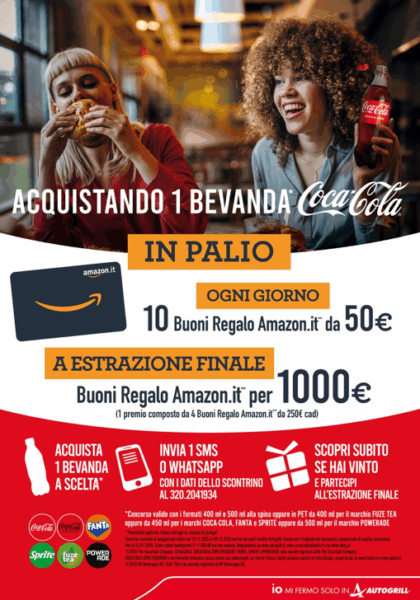 A partire dal 19 novembre al 9 dicembre 2025, acquista una bevanda Coca-Cola nei punti vendita Autogrill e prova a vincere un buono regalo Amazon da 1.000€ ! Il concorso…